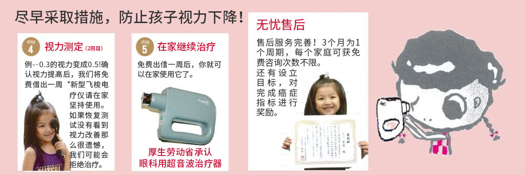 每天将超声波治疗仪敷在眼皮上10分钟,让眼睛和脑细胞恢复活力,达到改善视力的目的。